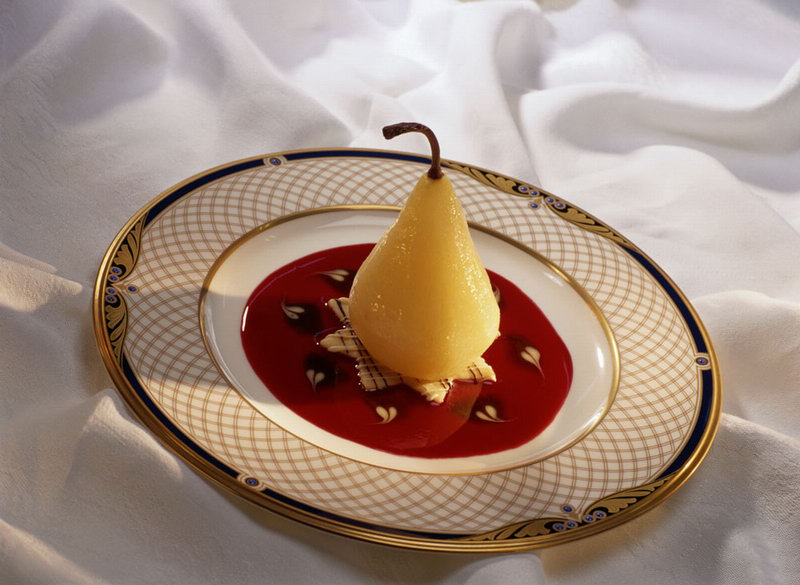 zarte Lachspraline auf Salat * * * gefülltes Hähnchenbrustfilet mit Blattspinat Hirschbraten "Baden Baden" mit Preiselbeerbirne Gemüsevariation, Waldpilze, Blumenkohlröschen & Rotkohl Kartoffelvariation mit Petersilienkartoffeln, Spiralkartoffeln & Thüringer Klöße * * * Eisvariation von Haselnuss und Vanilleeis am Schokoladengitter und Fruchtbukett auf Soßenmalerei